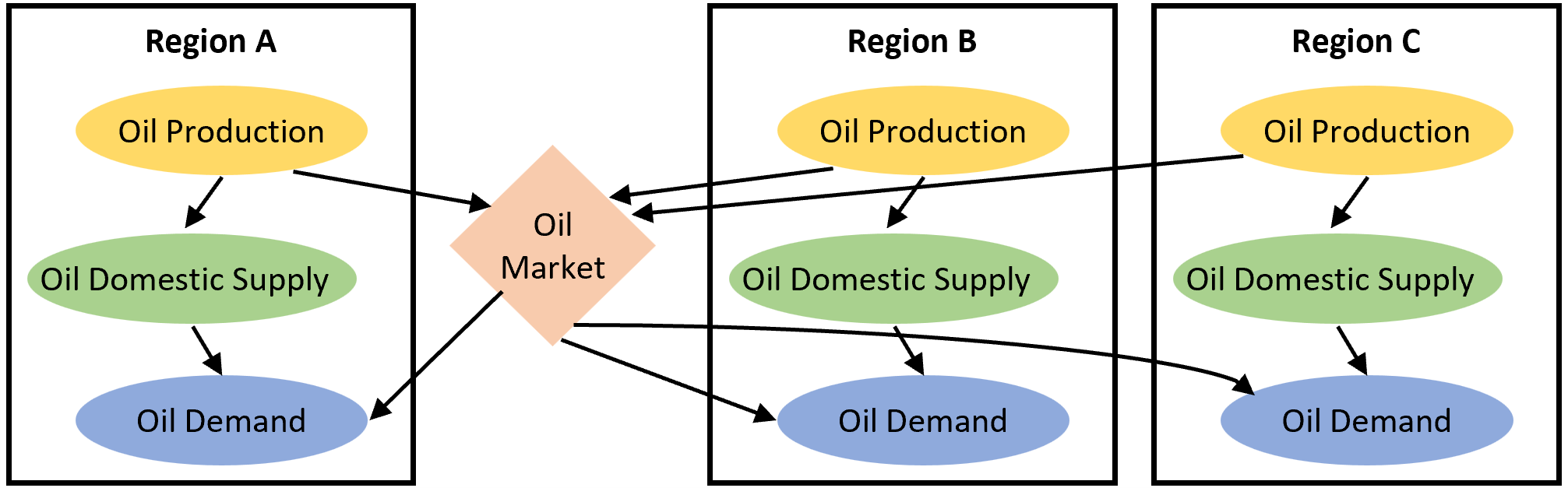 Figure 1.1. Import-based trade mechanism for a representative fossil fuel (i.e., oil) and three representative regions. |